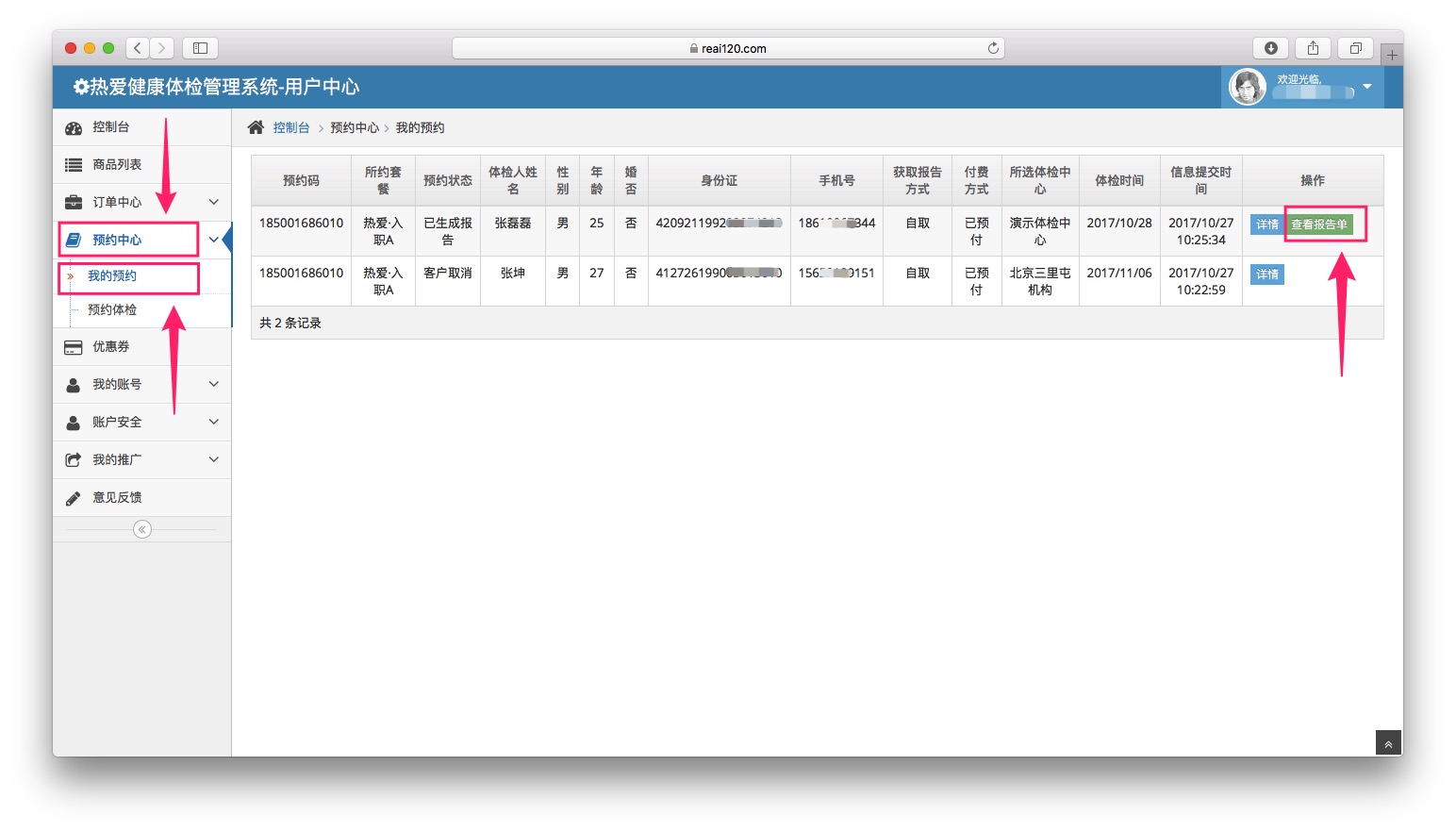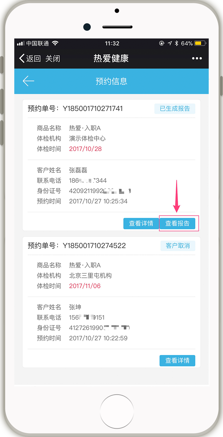 进入个人用户中心后点击「预约信息」查看相关预约信息,点击「查看报告」即可阅读详细体检报告